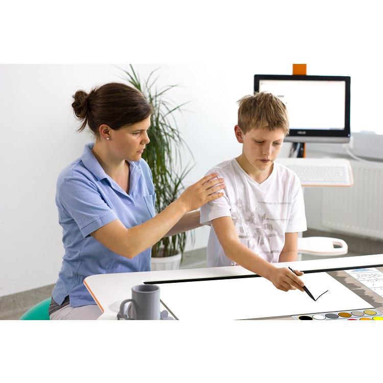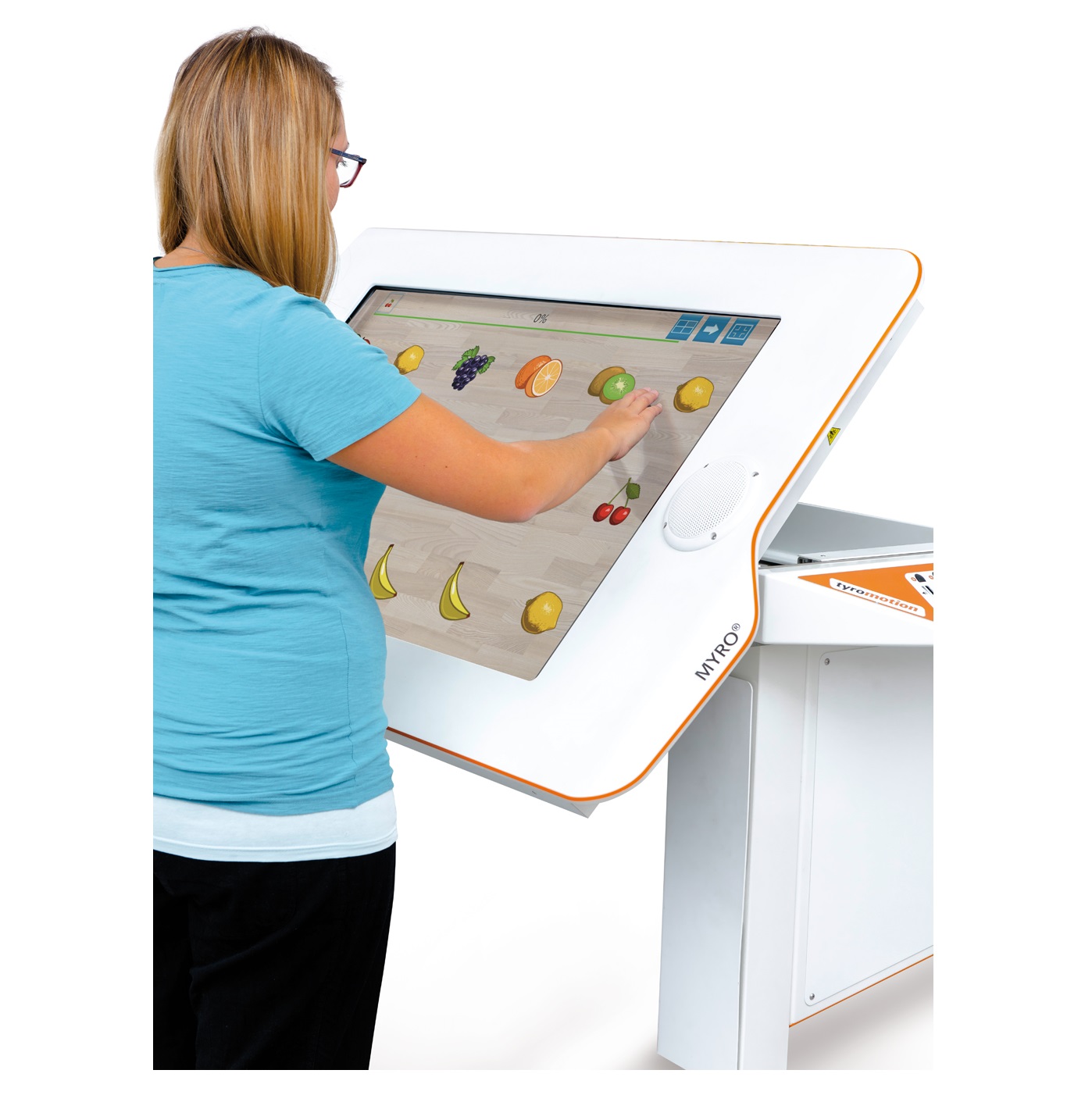 Myro adapts to the needs of each patient; horizontally and vertically: Myro is height-adjustable and the work-surface can be tilted from 0 to 90 degrees. And even Myro’s responsive area can be scaled to the patient’s ability, which allows training at the personal limit of performance